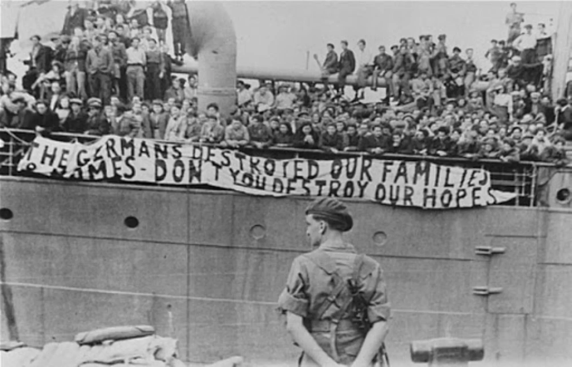 A ship loaded with Jewish refugees arrives in Haifa Port during World War II.