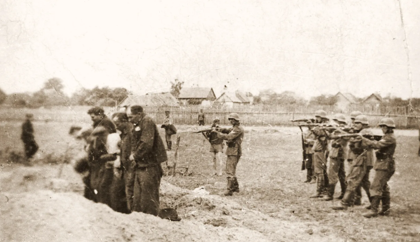A group of Jewish men being executed by the German SS Einsatzgruppen (mobile killing squads) in Eastern Europe during the Holocaust.
