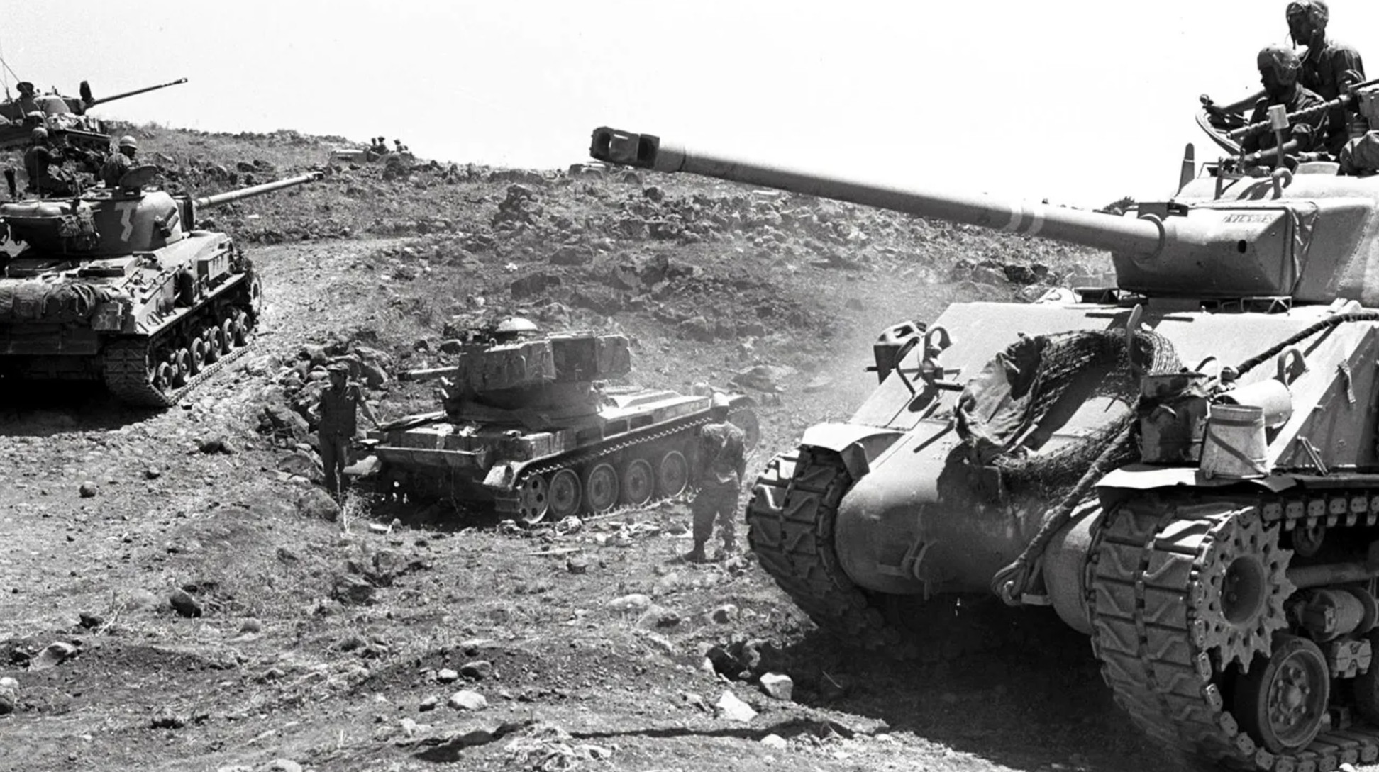 An Israeli tank unit navigates the terrain of the Golan Heights during the Six-Day War, June 10, 1967