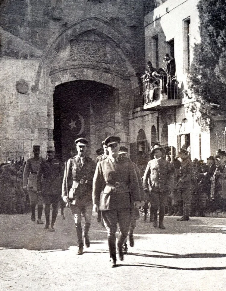 Lord Alfred Allenby strides through the Old City from the Jaffa Gate in December, 1917, after the British victory against the Turkish Ottoman Empire in Jerusalem.